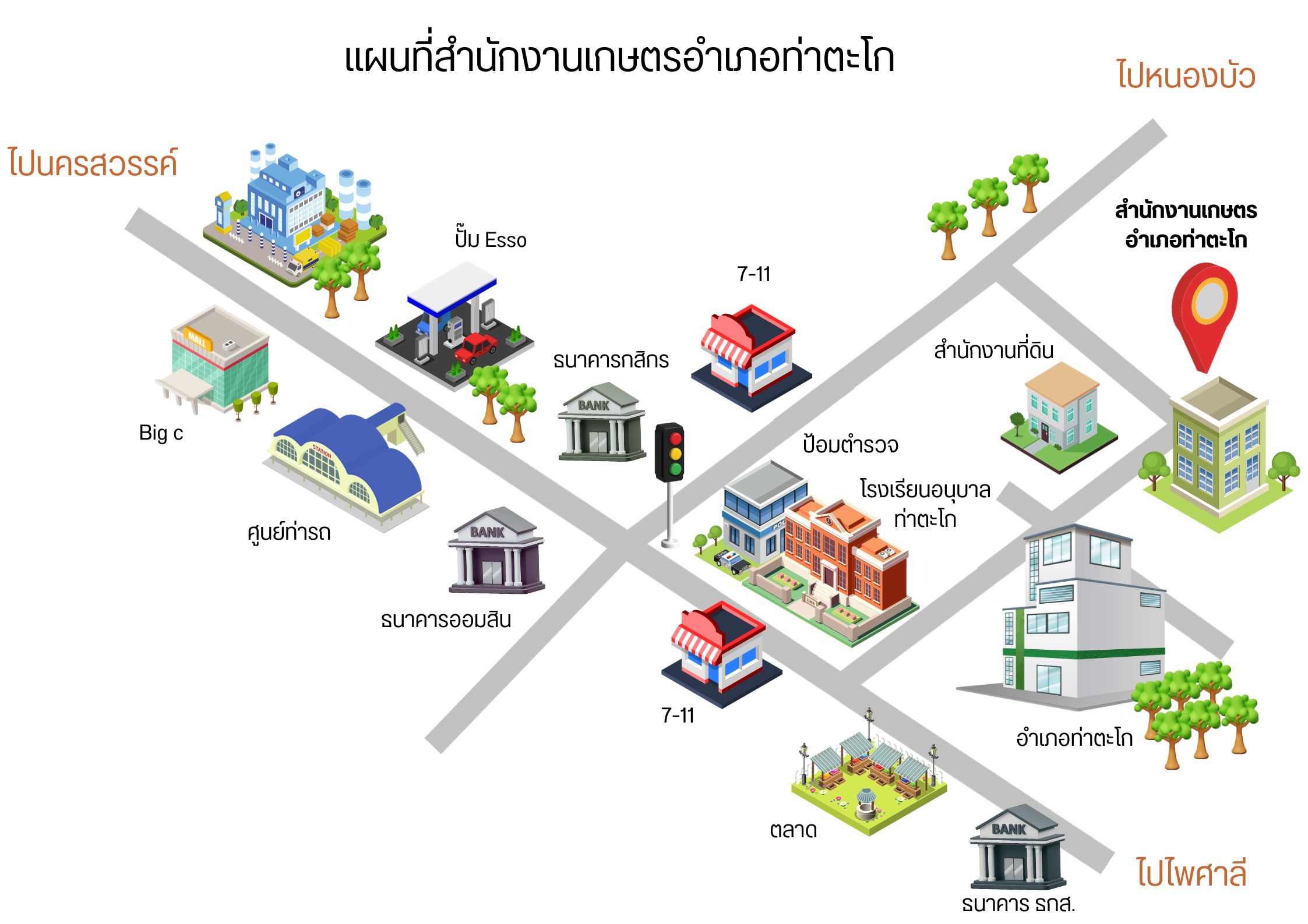 จุดเริ่มต้น จากแยกเดชาติวงค์ เดินรถตรงมาเรื่อยๆ ระยะทางประมาณ 2 กิโลเมตร พบแยกไฟแดงหน้าค่าย เลี้ยวขวาเดินรถตรงประมาณ 3 กิโลเมตรพบแยกหน้าสถานีรถไปนครสวรรค์ เลี้ยวขวาเดินรถตรงมาเบี่ยงซ้ายตามทางถนนพบทางรถไฟ เดินรถผ่านทางรถไฟประมาณ 40 กิโลเมตร พบแยกไฟแดง ตากฟ้า – ท่าตะโกเดินรถตรงมาเรื่อยๆระยะทางประมาณ 5 กิโลเมตร พบแยกไฟแดง จุดสังเกต หน้าธนาคารกสิกรไทย และฝั่งตรงข้ามธนาคารออมสิน เดินรถตรงระยะทาง 200 เมตร เลี้ยวซ้ายเข้าที่ว่าการอำเภอท่าตะโก เดินรถเข้าที่ว่าการอำเภอประมาณ 200 เมตร (ผ่านด้านหลัง) พบสำนักงานเกษตรอำเภอท่าตะโก
